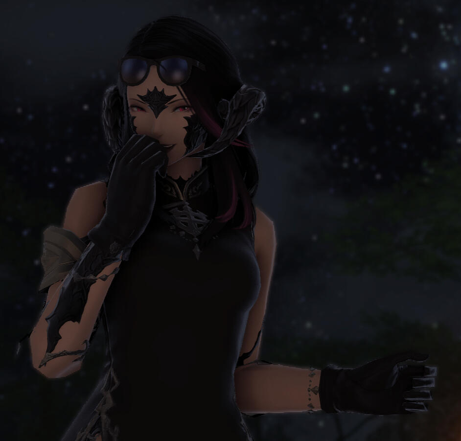 Long black hair, black clothes and black sunglasses are the typical style this young AuRa is usually seen in. Her dark pink and glowing umbral eyes along with the small wisps of pink in her hair are the most colour you might see on this females small frame. Black scales and a sharpened tail adorn her body as well as many tattoos in black and red ink. Pale, smooth skin lie hidden behind the blackened steel of her armor or beneath her usual leather clothing for those who are lucky enough to see it.Lusted for blood, this Eulmorian fiend prefers journeying at night and enjoying the night life up close and centre. Music and dancing are passions she enjoys, but due to her current unbonded state, she's reckless, wild and untamed. If you choose to approach her, be warned.Recently unbonded from her ex lover, she walks Eorzea souless and emotionless, not caring for anyone or anything and aggressively taking what she wants from anyone she sees. Lust and power are things she's currently feeding into, so use caution when approaching this fiend as things could take a negative, or positive turn for you.Short fangs sit behind her smiling lips and umbral eyes glow with lust and passion as she looks for her next victim from the darkness...